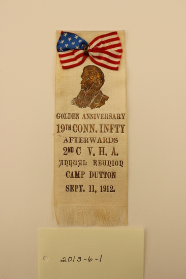 Ivory silk G.A.R. golden anniversary ribbon with American flag at top with metallic ribbon at center to create a bow. Printed in gold: three-quarter profile of Dr. B.F. Stephenson, founder of the G.A.R, "GOLDEN ANNIVERSARY / 19th CONN. INFTY / AFTERWARDS / 2nd C.V.H.A. / ANNUAL REUNION / CAMP DUTTON / SEPT.11, 1912." Slits were made at bottom sides and the bottom fringed. Top of ribbon folded over to the back and long stick pin secured. Sticker paper label on back.