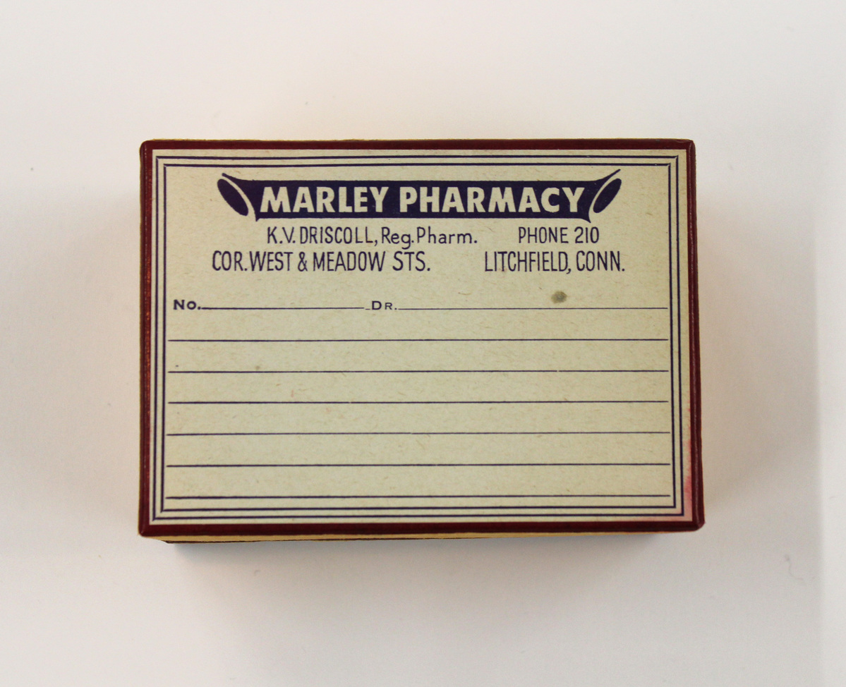 Rectangular cardboard prescription box, covered in a dark red paper with ribbons of textured yellow paper attached around edges. Box has removable lid. Printed paper label on lid, blue and white text on white background: "MARLEY PHARMACY" in white text within blue banner; blue text underneath, "K.V. DRISCOLL, Reg. Pharm./PHONE 210/COR. WEST & MEADOW STS./LITCHFIELD, CONN." with lines for prescription information underneath.