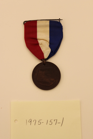 G.A.R. medal. Bar pin with red, white and blue striped ribbon, gathered into bronze ring. From second ring is suspended circular bronze medal with lettering: "WELCOME VETERANS / CAMP DUTTON / THE 19th CONN. INFANTRY / AFTERWARD / 2ND CONN. HEAVY ARTILLERY / MUSTERED INTO U.S. SERVICE / ON THIS FIELD / SEPTEMBER 11, 1862 / ERECTED 1912 / BY THE SURVIVORS."