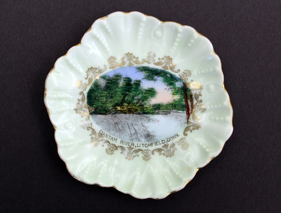 Small souvenir dish. Green dish with scalloped edge bordered in gold. Center of dish is transfer printed with a color image of a river lined with trees. "BANTAM RIVER, LITCHFIELD, CONN." in black lettering below image. Gold decorative border stamped around image.