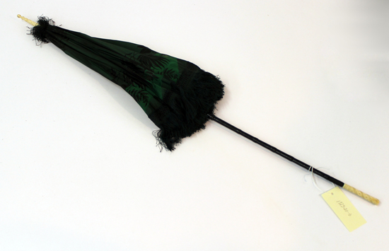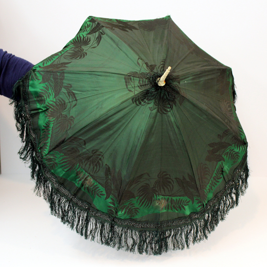 Parasol; folding; green silk compound weave with pattern along tips in lighter green of ferns, palm fronds and other foliate; green and black band on fringe with long black and green fringe; thin black tube with banding at regular intervals; ivory handle with serpentine vines and dimpling; matching ivory ferrule