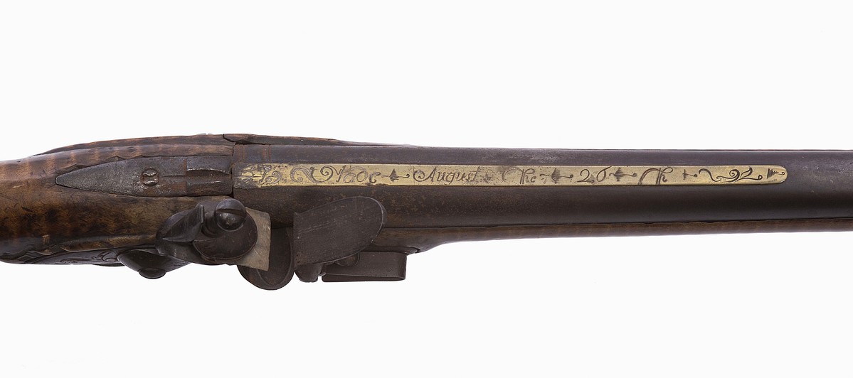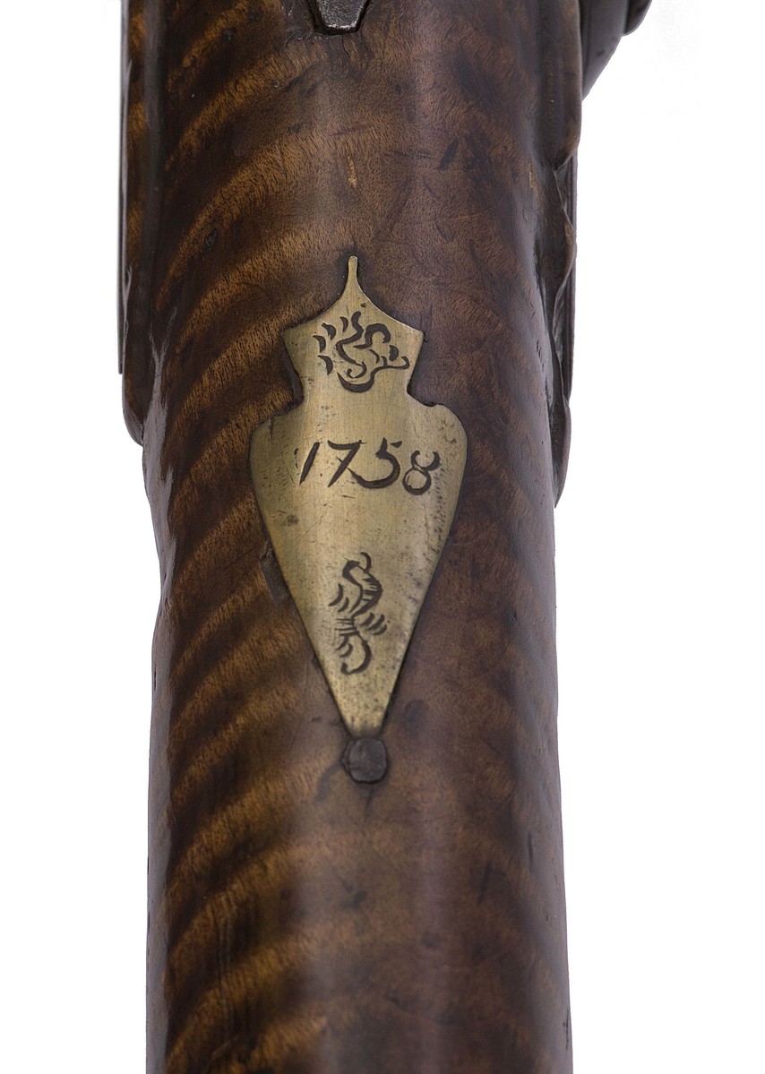 Tiger tail maple long gun. Iron barrel with sight at end, a small knob, iron side plate, pointed tang, scrolled trigger, and percussion cap. Additional brass plates have inscriptions and decorations. Top plate reads, " Made August the 20th". Smaller wrist top plate reads, "1758". Butt plate reads, "Made/ by Medad Hills at/ Goshen". The original flint lock had been converted to percussion, flintlock restored in the 1970s with nonoriginal hardware. Barrell shortened but restored in the 1970s.