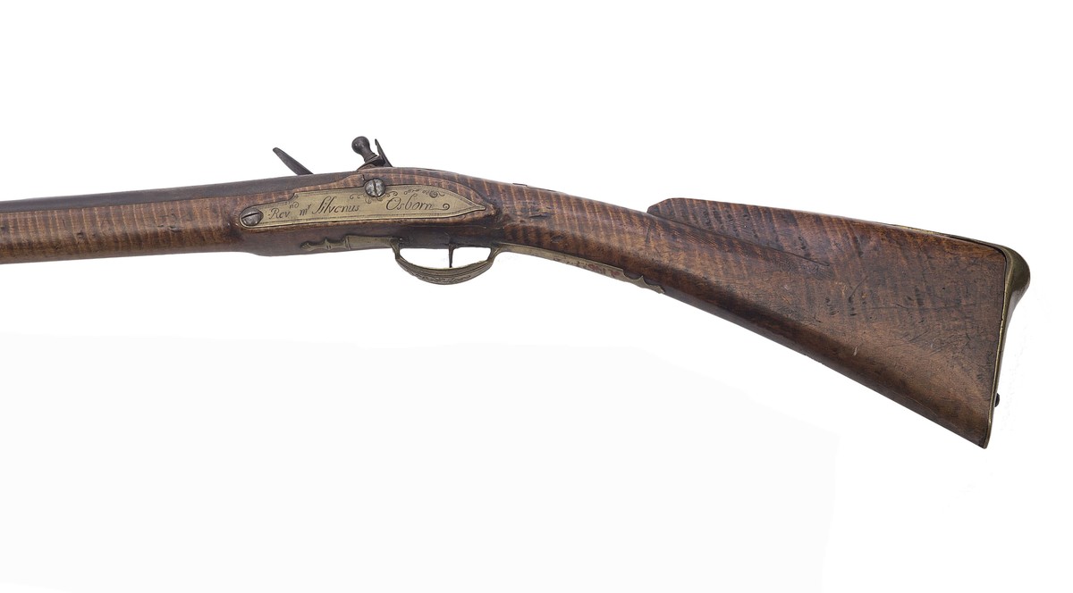 This gun was made for, and owned by Rev. Sylvanus Osborn, the first minister in Warren, CT in 1758. Osborn was called to Warren in June of 1757, and was their minister for fourteen years. During that time he is said to have carried this gun in "The War" - likely the French and Indian War.