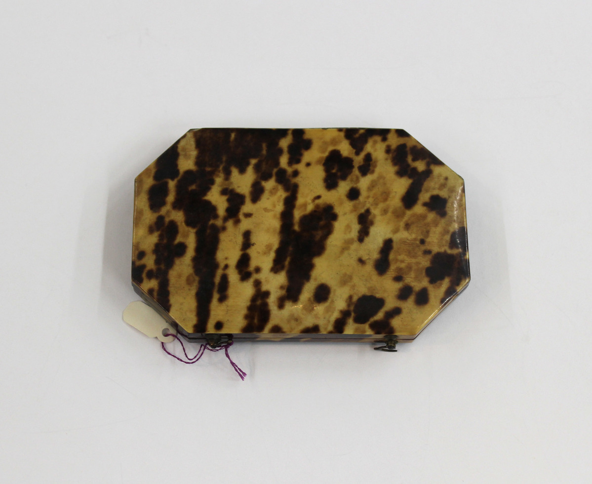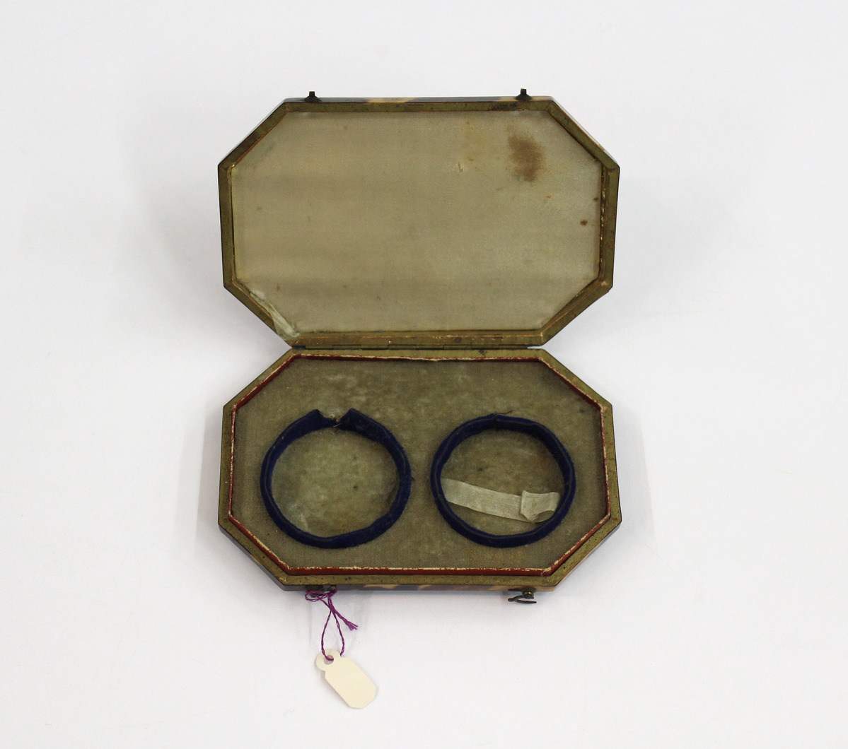 Octagonal watch case of painted wood with carved tortoise shell exterior. Hinged top with two brass hook fasteners at the front. Lid interior lined with white silk, remainder of case lined with grey velvet; gilt paper lining on interior wood. Two circular watch receptacles rimmed in blue velvet, with red pasteboard border around bottom. Bottom of case is covered in embossed blue paper.