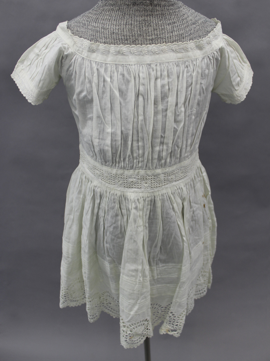 White sheer white cotton child's dress; scoop neck edged with embroidered ruffle; short puff sleeves; embroidered waistband; gathered skirt with tucks and scalloped eyelet lace border (Broderie Anglaise); center back opening with two covered buttons and two buttons with loops at waistband; machine and hand-stitched