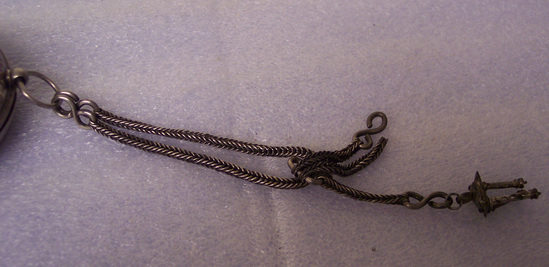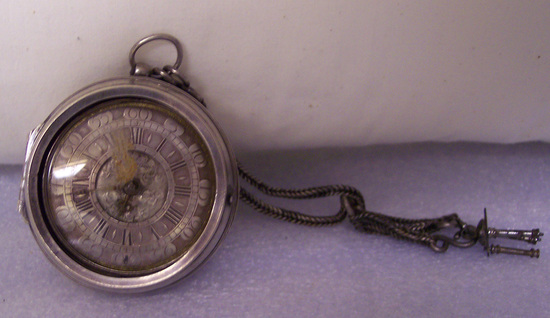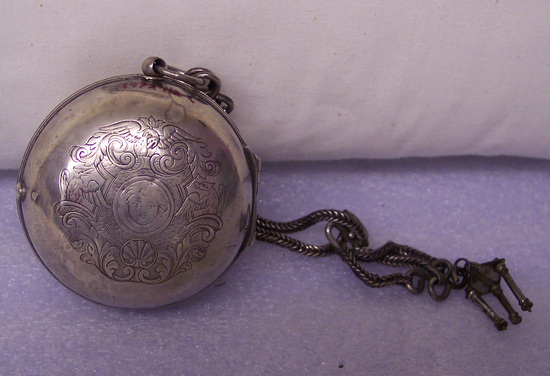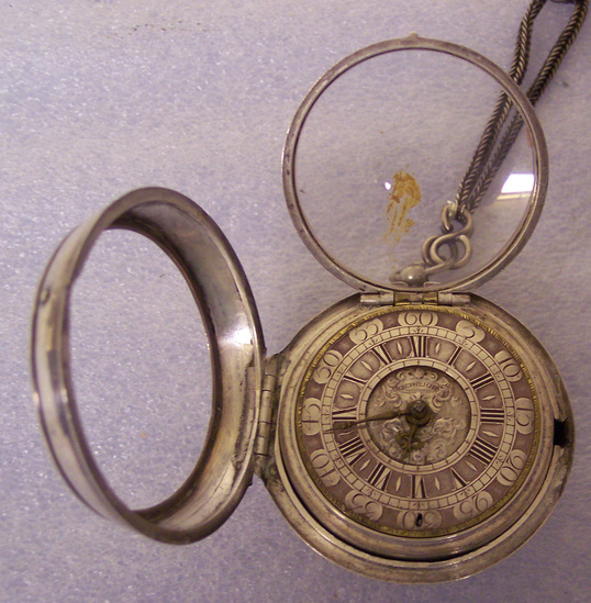 The cover of watch is silver engraved decoration on back, child's head surrounded with strap work, shell and three eagles. Catch on side opposite hinge and top has hole for stem. Watch face - hours in Roman Numerals inland in black in silver, minutes in arabic numbers on outer edge. Brass hands and brass around edge. Center of face is lower than face and is carved with scrolls and one Cherub's head, shell and eagle's head about banners with names engraved on them. The works are brass, chain driven. The works are contained under an elaborate open work top held up by four vase standards. It has a double, closely linked silver chain with hook for key (missing) and a temple-like watch fob, which is late 19th century. The mid-bracket of chain is also silver and is marked "VI" on raised rectangle. Engraved on face "Cartwright/London" Mark inside cover R.B. in rectangle same mark inside watch. The brass works are marked "T. Cartwright/London" The watch belonged to Brewster family for three generations - Philip B. Brewster; Rev. William J. Brewster and his father -------------- of New Haven, CT. Could have belonged to Elder William Brewster.