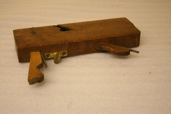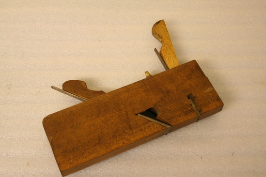 Rectangular wooden plane. Flat shaped iron blade protruding from bottom with wooden peg holding blade in place. Oval shaped hole cut out of plane just above where blade protrudes from bottom. Brass screw at top of plane. A second, smaller and thinner iron blade protrudes from top of plane straight down through bottom. An oversized wooden peg holds the blade in place. Stamped on plane "Union Factory Warrented", "H. Chapin" and "G.W. Smith"