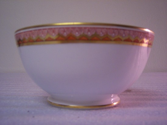 Slop bowl has decorative motif of gold bands and a band with a gold border of red leaf and scroll. Gilt, star medallion in the center of the bowl. Marked "714" and "2" on the bottom. Asian inspired design. This is the wedding tea set of Anna Pierce Brace, (Mrs. Charles Loring, married May 6, 1818). Wedgwood #714, "Bittersweet." It was inherited from Mrs. Pennypacher's mother, Mrs. Ruth Loring Whitman; and by her from Mary Hopkins Loring; and by her from Anna Pierce Brace Loring.