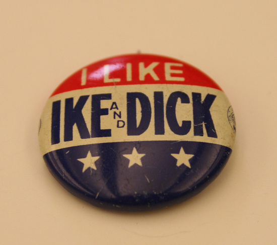 Button - red, white and blue horizontal stripes. In red strip in white lettering "I like" in white stripe in blue lettering "IKE and DICK" in blue strip, three white stars