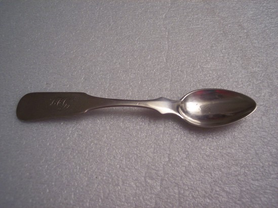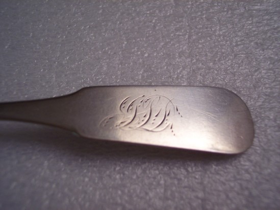 Silver teaspoon, engraved on front of handle "JLD" and hallmarked on back of handle "A. PEDEN"