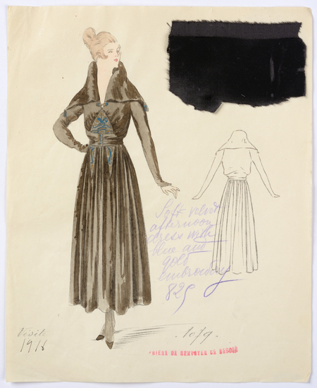 Lithograph and watercolor on paper fashion design. Soft gray velvet afternoon dress with blue and gold embroidery. Fabric samples accompany rendering.