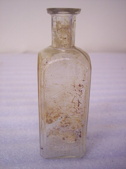 Clear glass bottle, raised lettering on one side of bottle "Wessels & Gates Litchfield, Conn" images of eagle and coat of arms underneath