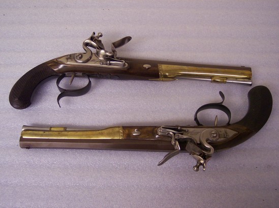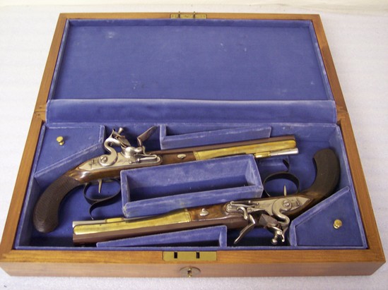 A: wooden box with light blue velvet interior. Blue leather inset on lid of box. In gold lettering "The Alexander Hamilton - Aaron Burr/Flintlock Dueling Pistols" Gold border around edge of leather. Inside has space for two pistols. Three compartments: one in center, lid missing; two on opposite corners with lids. B,C: Pair of pistols. Wooden carved handle and body with brass, copper an dsilver muzzle. Pewter flintlock mechanism. "Wogdon" inscribed on side and top of mechanism. Guns highly decorative D: brass key to box (A)