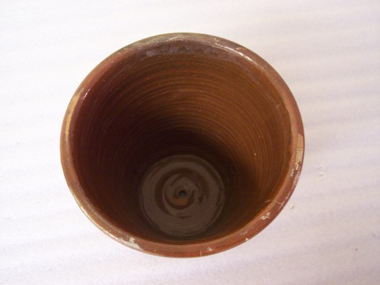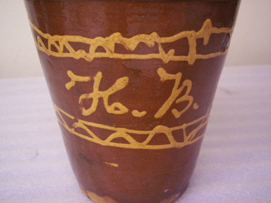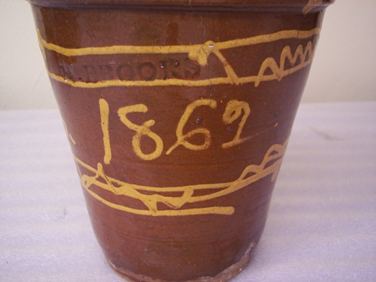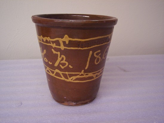 Clear glaze with yellow slip line design. Rolled rim, plain base. Hope in center of base. Written in slip "H.B. 1862"