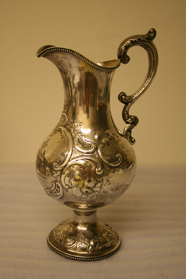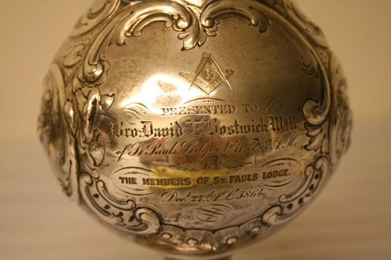 Silver pitcher. Round, swelled base decorative with a beaded rim and a band of flowers and leaves in repousse. The container, soldered to the smaller diameter of the top of base is bulbous and gradually diminishes in size until throat flares into the curved top rim and lip. The case, hollow silver of rococo design is attached at top and on side. The front is decorative with repousse rococo design around a cartouche in which is engraved a small compass and square rule surrounding a "G" under which is "Presented to/Bro. David E. Bostwick, W.M./of St. Paul's Lodge No. 11 F. & A.M./By/the Members of St. Paul's Lodge./Dec. 27th A.L. 5864"