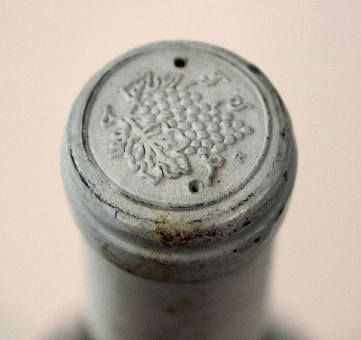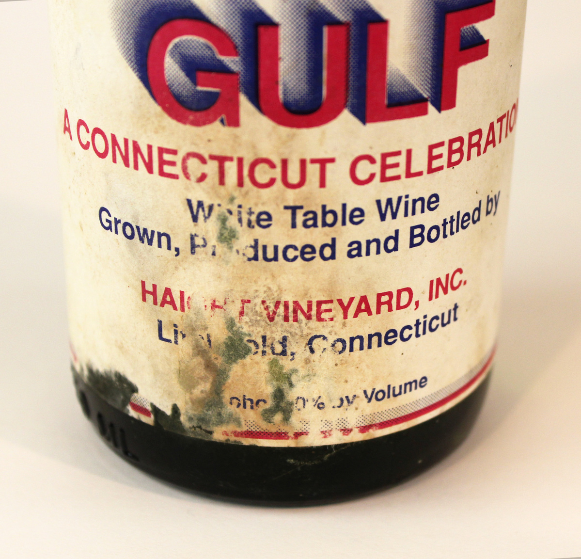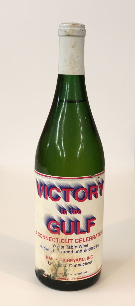 Sealed glass wine bottle containing white wine produced by Haight Vineyard, Litchfield, Connecticut. Green-colored glass bottle with round base, tapering at top. Rectangular, white paper wine label with red and blue printed text, "VICTORY/IN THE/GULF/A CONNECTICUT CELEBRATION/White Table Wine/Grown, Produced and Bottled by/HAIGHT VINEYARD, INC./LITCHFIELD, CONNECTICUT." Label also includes required statements of sale, government warning, and alcohol content. Tin capsule with white coloring, embossed motif of grapes at top. Maker's mark on bottom of bottle.