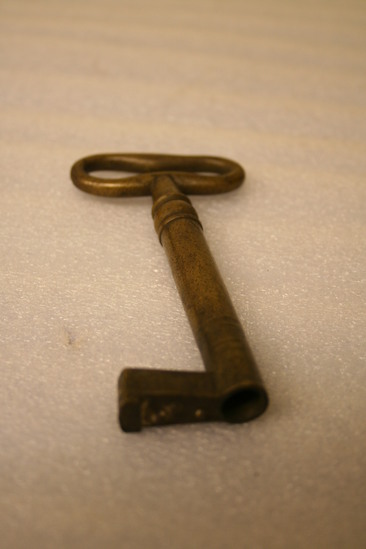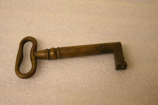 Brass key - oval shaped head, slightly misshapen; rounded shaft with slight turnings at top; single protrusion from bottom of shaft