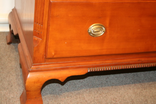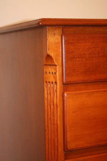 Cherry chest of drawers with pine wood interior. Bevelled top, scroll design above feet. Section of gadrooning at base. Corners are bevelled with lamb's tongue champher. 4 incised lines running length of bevel and 4 small marks above and below lines. Keyholes on all drawers but lock mechanisms have been removed. Top secured with peg to base. Drawers have cherry fa�ade with pien bodies, dove tailed. Brass handles are oval shaped.