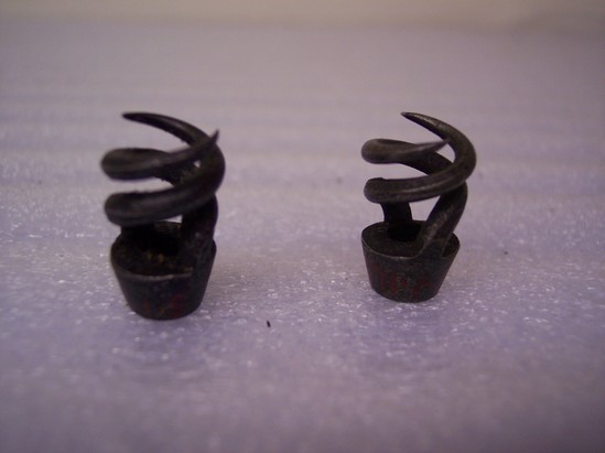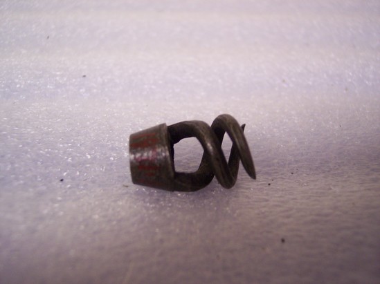 Round piece of steel bored at small end; sides sloping with two prongs twisted in opposite directions and ending in points. Held to cloth to clean muskets