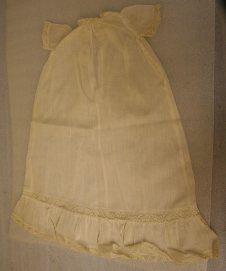 Whiet batiste doll's dress with edging of pillow lace at high neckline, sleeve and hem which also has deep batiste ruffled edged with lace.
