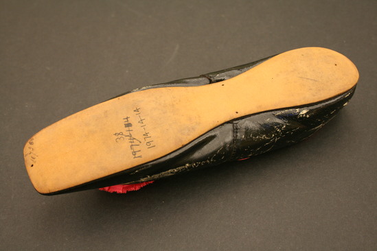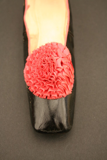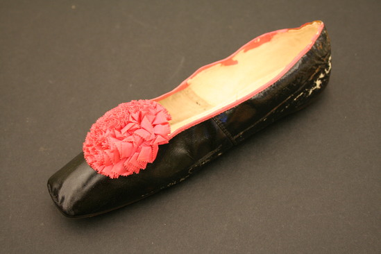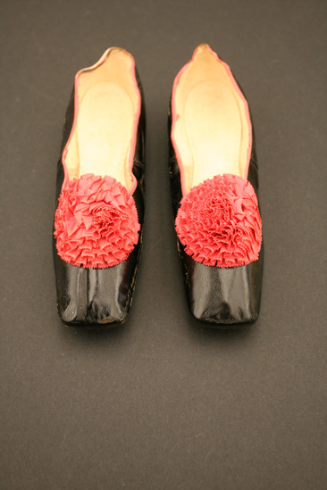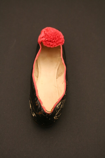 Black leather woman's shoes; lined with white leather and linen; pink silk binding over drawstring; pink satin gathered into rosette/pompom which is backed with marbled paper; sewn onto top of toe; leather sole; flat with no heel