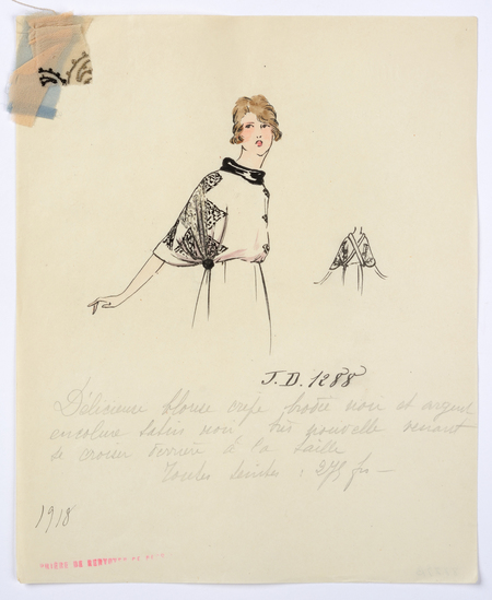 Lithograph and watercolor on paper fashion design. Crepe blouse embroidered with black and silver. Black satin collar. Crossing in back at waist. Fabric samples accompany rendering.