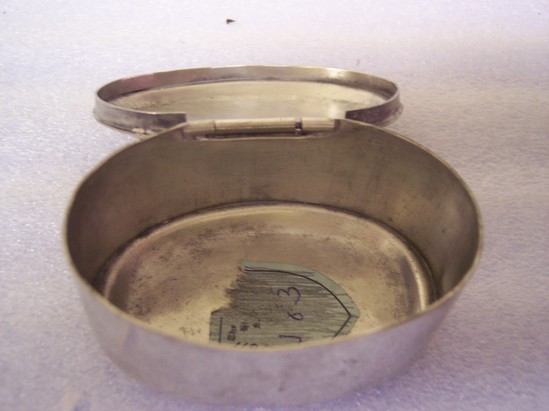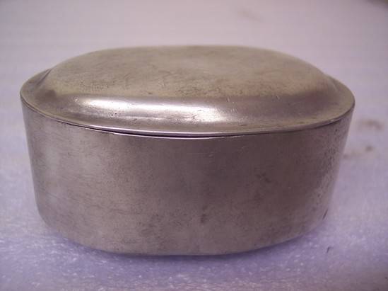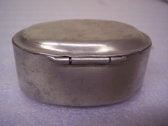 Oval pewter box with hinged lid. Lid has slightly domed top and bottom.