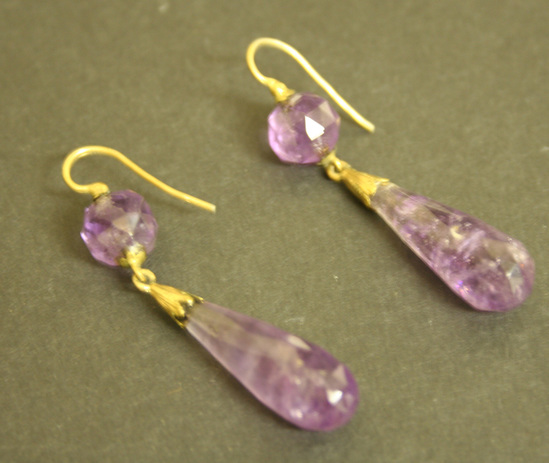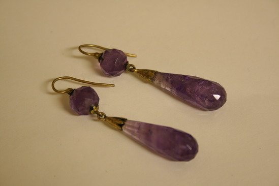 Pair of earrings for pierced ears. Simple pierced ear loop with ball and tear drop pendant of fractured light purple amethyst.