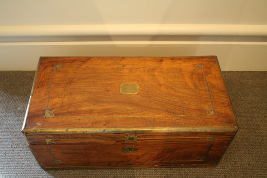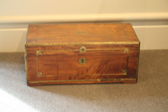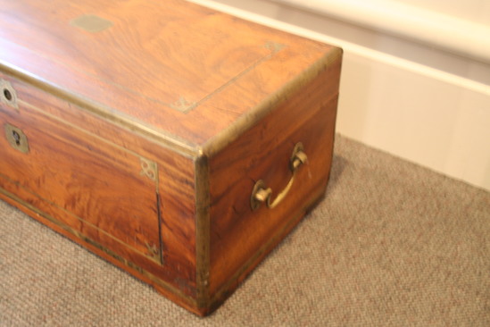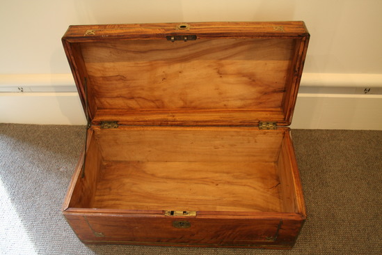 Wooden chest. Hinged lid. Brass inlay on all four sides with decorative element in each corner on front of chest. Handles on two sides of chest. Slightly raised off of ground in center. Brass plates on each corner of chest. Key hole in center front of chest.