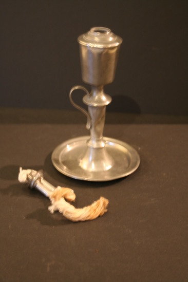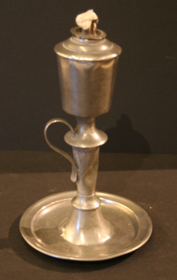 Saucer base with standard S handle and truncated cone top. Two wicks.
