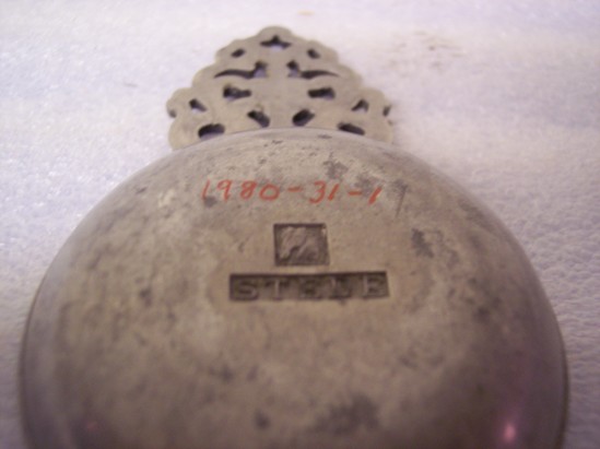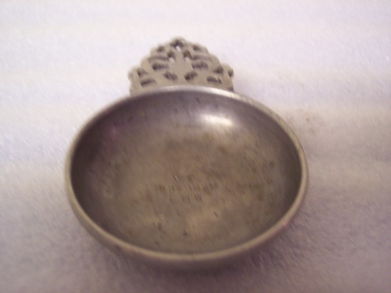 Modern reproduction of early american miniature porrigger form with 2 1/2" diameter bowl having 3/16" exterior lip. Handle is the ornate foliate form. Interior of bowl engraved: "VC/1852-1952/LHB" Last may stand for Lydia Hickox Brickley