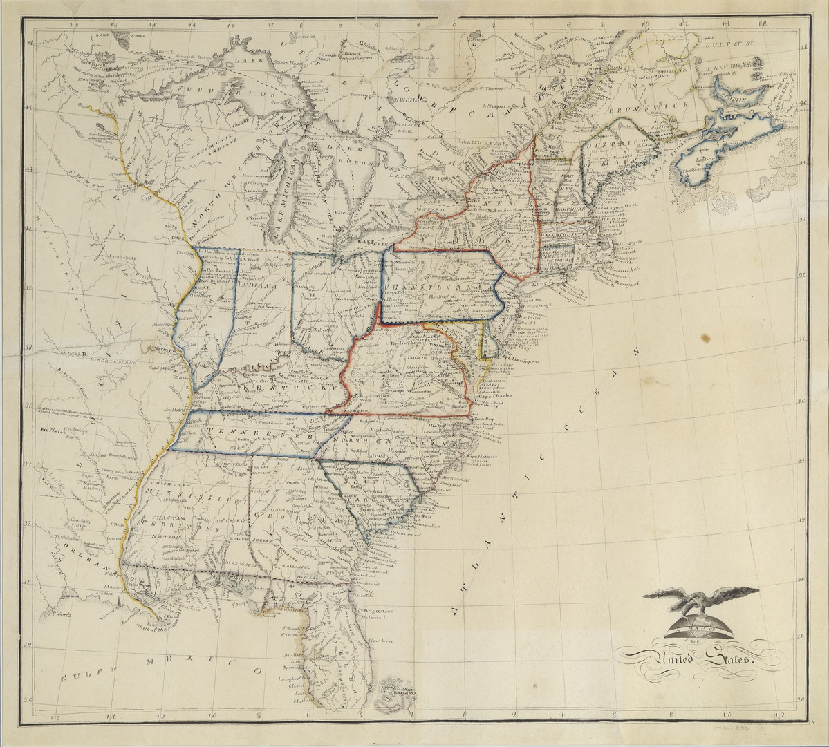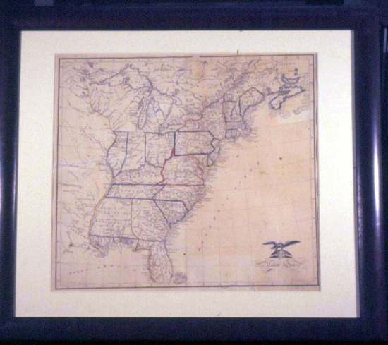 Hand drawn ink map of eastern half of the United States with states and territories outlined in various water colors. Cartouche with eagle in lower left corner. 26 degrees to 48 degrees latitude and a particularly American version of latitude with 0 degrees at Washington. Framed - black wood under glass. Inscription on back "Carolin Knickerboc(ker)/made by her at Litchfi(eld)/June 1814 (or 16)"