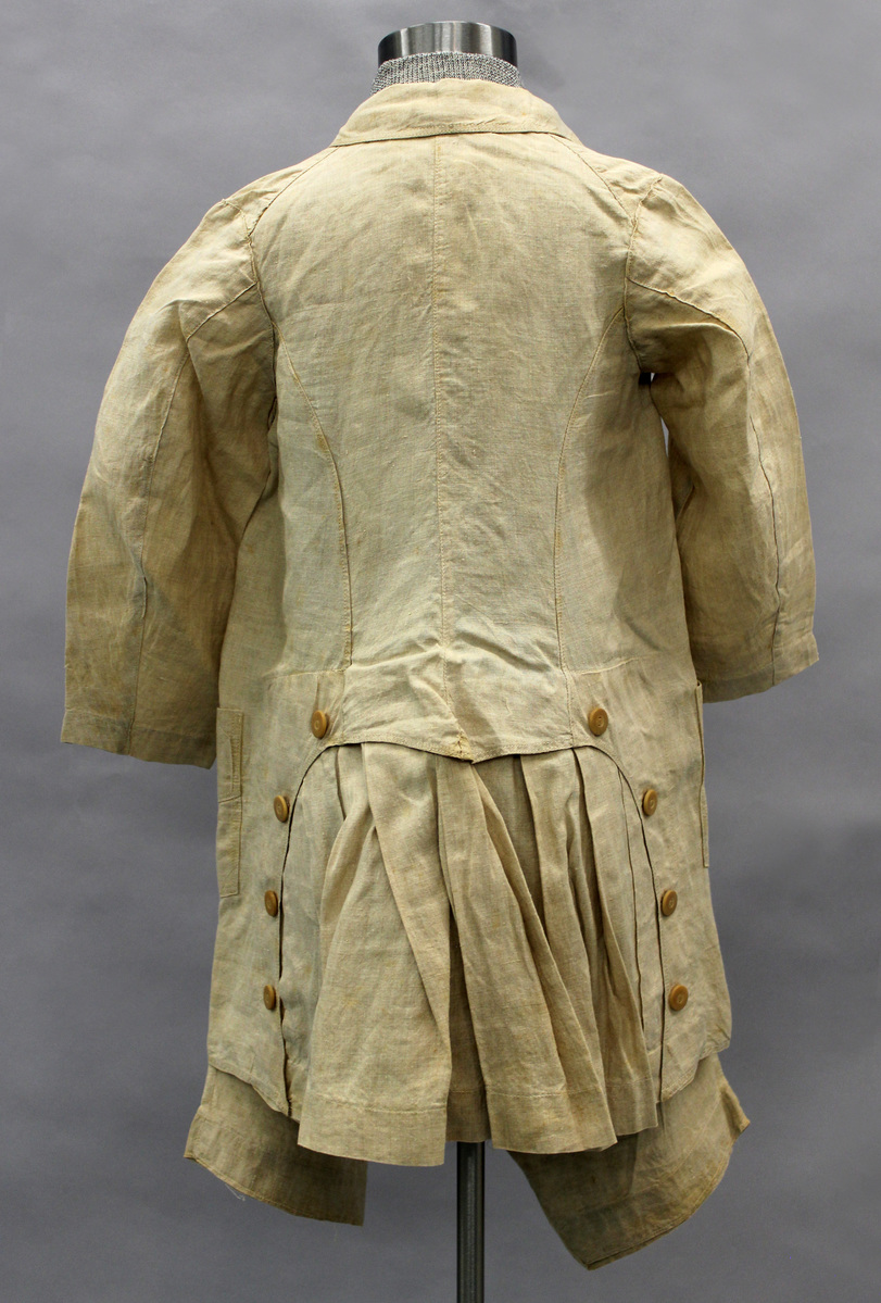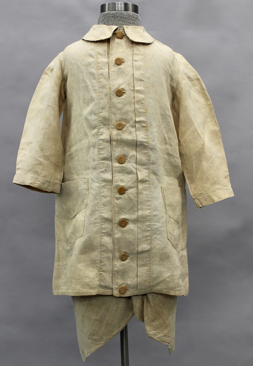 Tan linen boys suit: a: Knickers - knee length; waist band with six button holes b: Jacket - long, open, straight down front; nine bone buttons; vertical pleat on each side of the buttons and buttonholes; small round collar; half length sleeves; two pockets placed low in front; back with wide shaped cut out panel with a gathered insertion; eight bone buttons sewn on sides of insertion