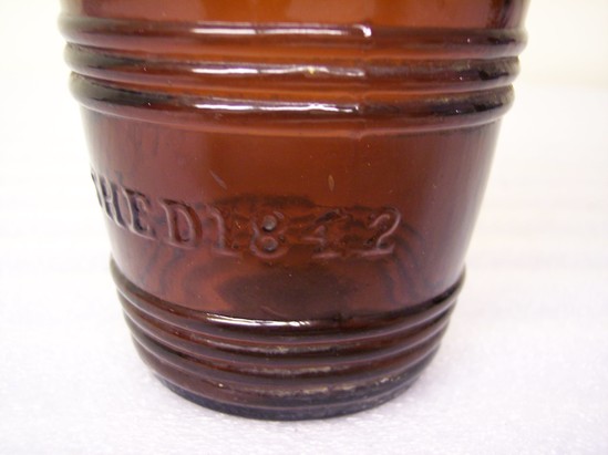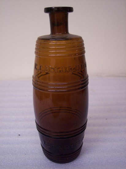 Amber two molded barrell style bottle with high neck and square profile rim. Four ridges on base, space, three ridges with "HALL'S BITTERS" in circle on one side, three ridges, space four near neck. Also embossed on bottle "E.E. HALL NEW HAVEN/ESTABLISHED 1842"
