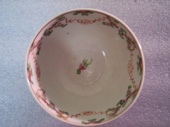 Tea bowl is decorated with garlands of flowers in polychrome and is overglazed. No handles. Has single, small flower at the base on the interior.