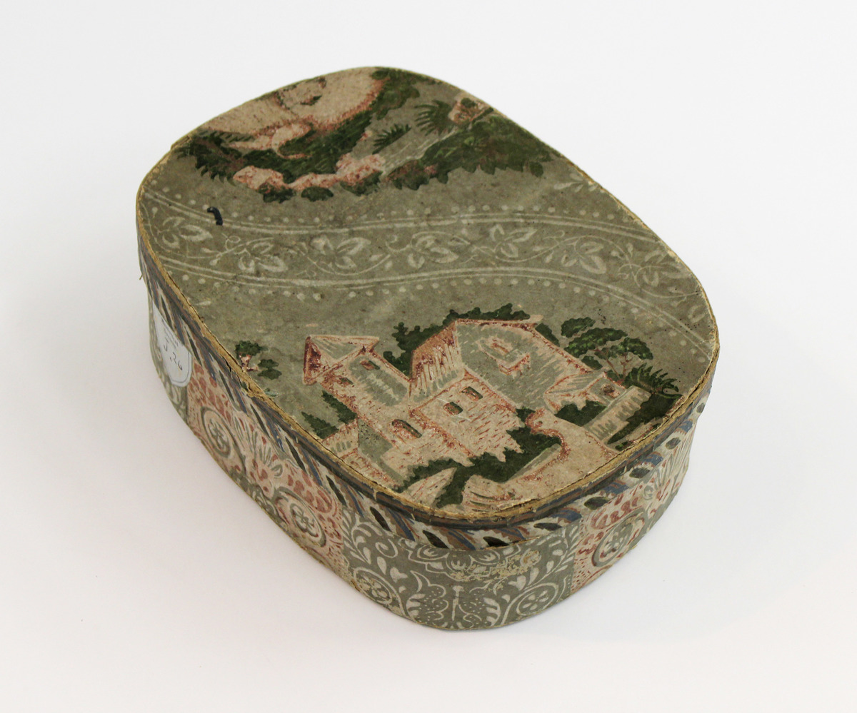 Oval board box covered in block printed wallpaper. The design features white and red floral motifs and scrolls around the outside, and white and red buildings and green landscapes on the lid divided by a curving band of white floral motifs. Around the rim is a repeating geometric pattern in white, black, red, blue and orange.