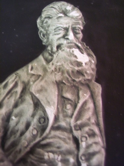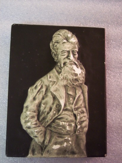 Matte black finished plaque. Square with molded relief of man with a full beard. Figure has a gray painted finish. "ACF" incised in lower left corner. Back reads: "John Brown/of Osawatomie/Born May 9, 1800/at Torrington, Conn./Executed at Harpers Ferry/Tyles Molded and Painted by Hand/Cr. Cranston-Fenner Studios/New Preston, Litchfield, County, Conn." "Cranston-Fenner incised" on the back as well.