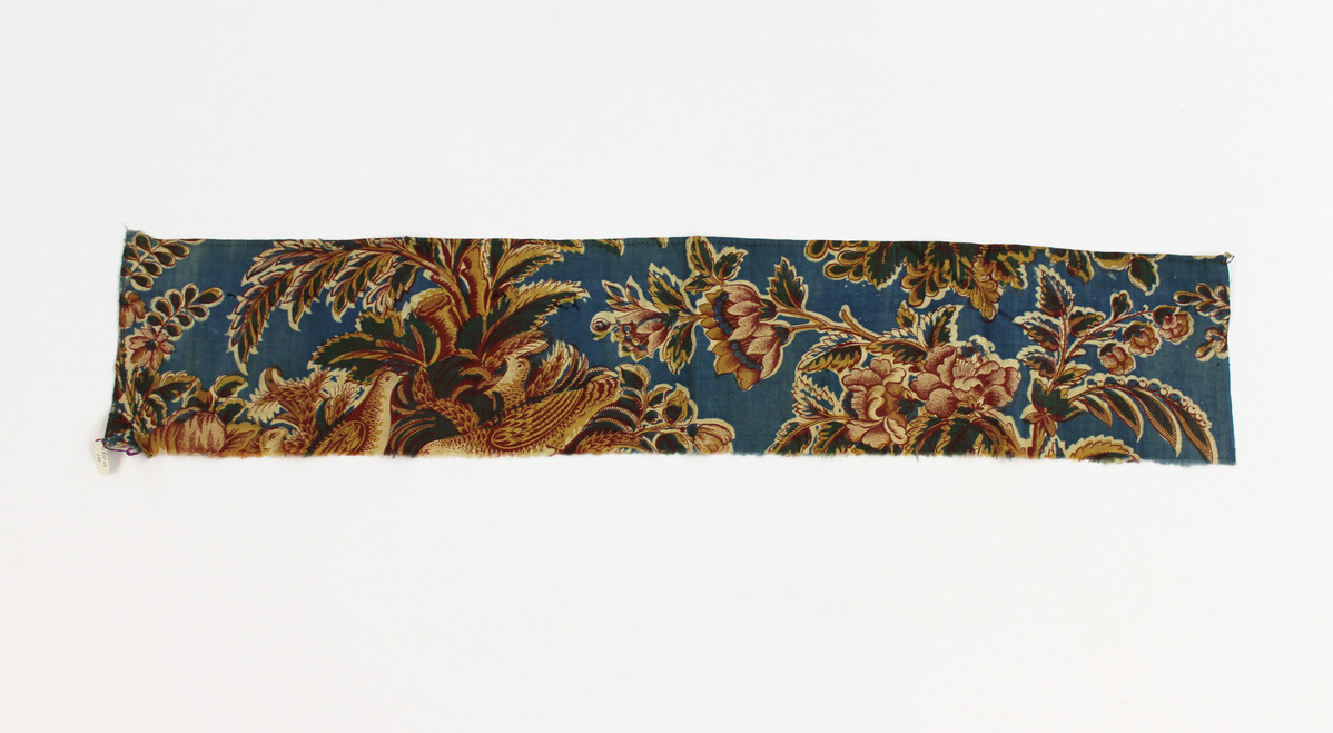 Five textile chintz fragments featuring roller printed design on blue ground. Design features repeating pattern of quails in rose trees, done in red, yellow, and blue. Originally glazed cotton. Fragments of different shape and size.