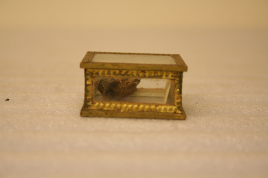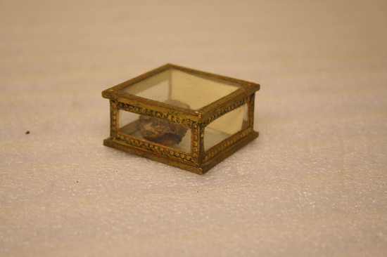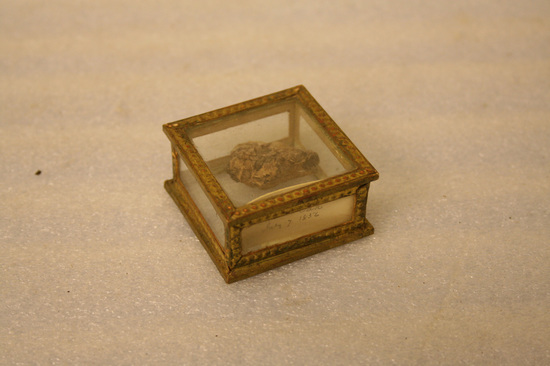 Small box made of six piece of glass bound at ends with embossed gold paper. Inside of box is an irregular shaped piece of the charter Oak. Note inside of box says "Charter Oak July 7, 1856, the year it fell and was cut up"
