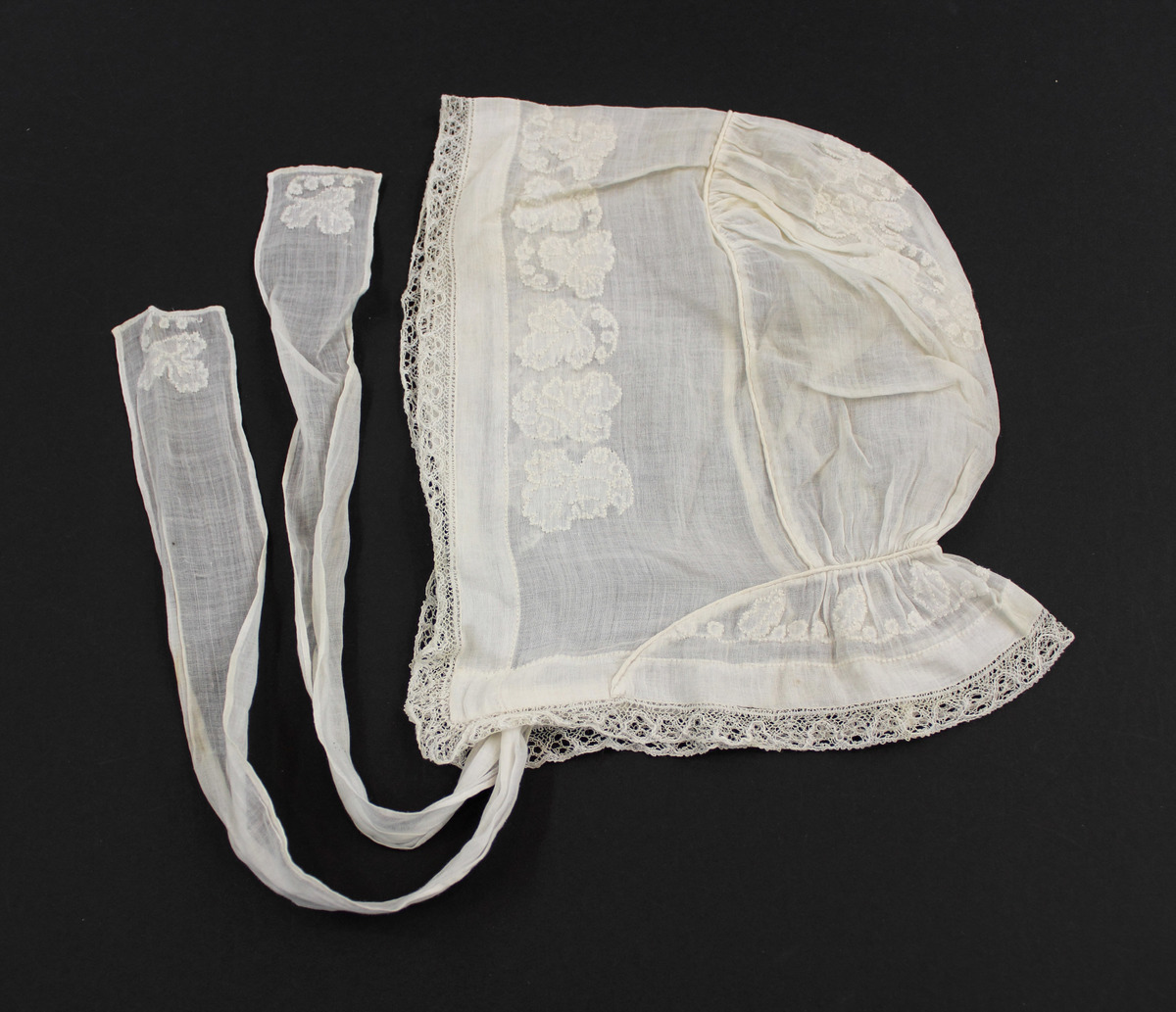 Off-white sheer cotton child's bonnet; lace at front and neck; leaf motif embroidery along front and back neck ruffle; piping along neck ruffle; gathered back section with piping; fabric ties with embroidered leaf at end