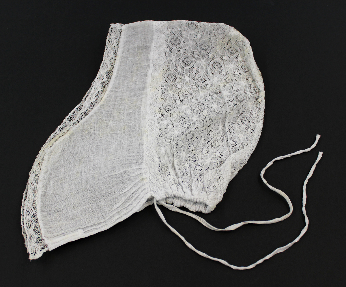 White sheer coarse cotton and lace women's bonnet; pleated edge at sides; lace along front edge; drawstrings at center back