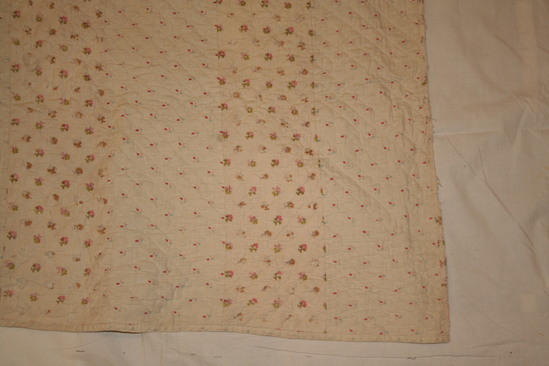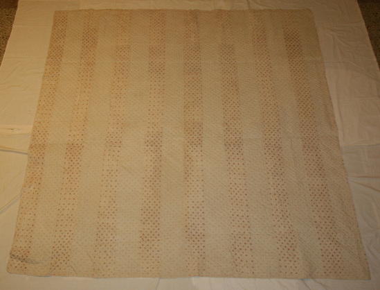 Quilted coverlet, 16 long panels, alternating white cotton with blue and red floral sprigs with brown dotted cotton with brown, red and green flowers. Each panel stitched diagonally. Bound in white tape, backed with white homespun linen.