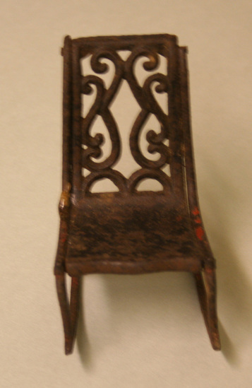 Small/miniature rocking rochar, 1 rocker broken, no arms, back of rocker scroll design, caste iron