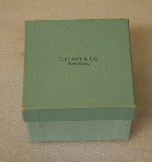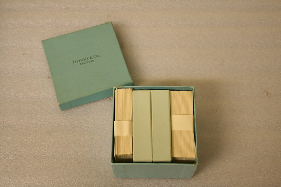 Blue cardboard box with lid. Printed on top "Tiffany & Co./New York" Inside box two groups of small white envelopes bound with paper ring. Printed on paper ring "Tiffany & Co." Smaller blue box in cente with separate lid. Printed on lid "Tiffany & Co./Fifth Avenue & 37th Street/New York" Box filled with heavy white cards, printed on each in center "Mrs. Frederick Baxter Danner"