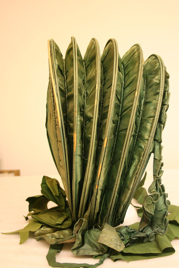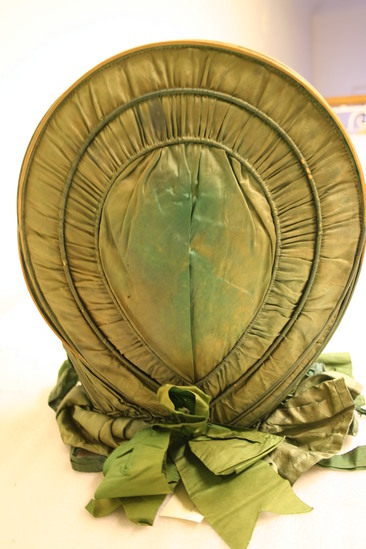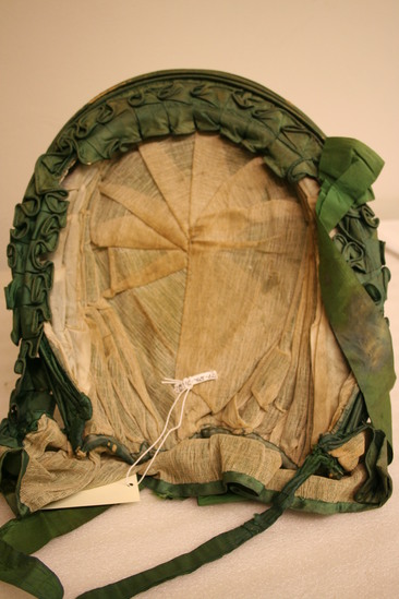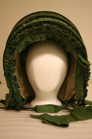 Green calash with white silk lining; big green bow at base of hat in back; two layers of green silk ruffles around face; two green tie ribbons at bottom front and one wide ribbon on right side half way up edge