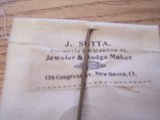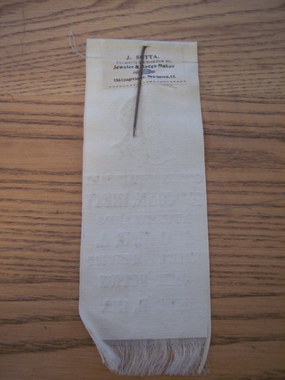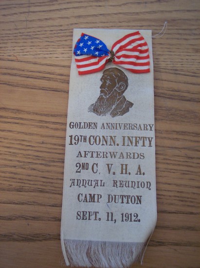 G. A. R. rectangular ribbon, frayed on bottom. Off white color. Small silk flag, cinched in middle with gold thread attached to top of ribbon. Profile of gentleman underneath stamped on ribbon in gold. Underneath written in gold lettering "Golden Anniversary/19th Conn. Infty/Afterwards/2nd C.V.H.A./Annual Reunion/Camp Dutton/Sept. 11, 1912" On back is large stick pin, metal. Maker's label glued on back "J. Sutta/Formerly 15 Meadow St./Jeweler and Badge Maker/136 Congress Ave. New Haven, CT"