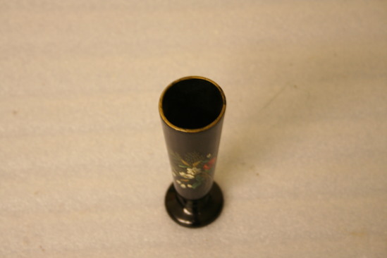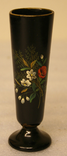 Small bud vase. Narrows from top to bottom with flared round base. Black with one floral spray painted on side. Yellow line around rim.