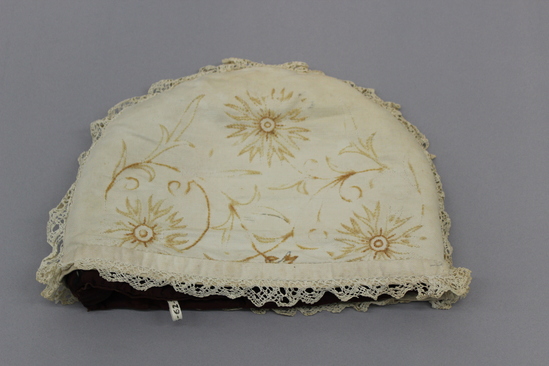 Plum-colored tea cozy with chevron pattern and embroidered white cotton cover. Cover has floral patterns embroidered in brown and tan thread, and tatted lace decoration applied to bottom and across middle.