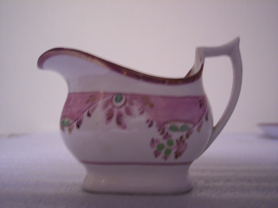 Pink luster highlights and floral swag motif in pink with green touches. Cream pitcher is low-bellied and has a handle and a wide spout.