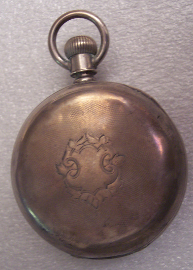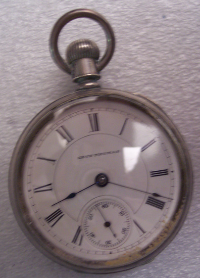 Silver watch, glass front, white enamel face with silver hands. Roman numerals around main face of watch with seconds displayed in Arabic numbers. Has separate second face in main face and winder at top. Belonged to Charles H. Warren of Watertown who would it by running winder along wooden fence on way to school.